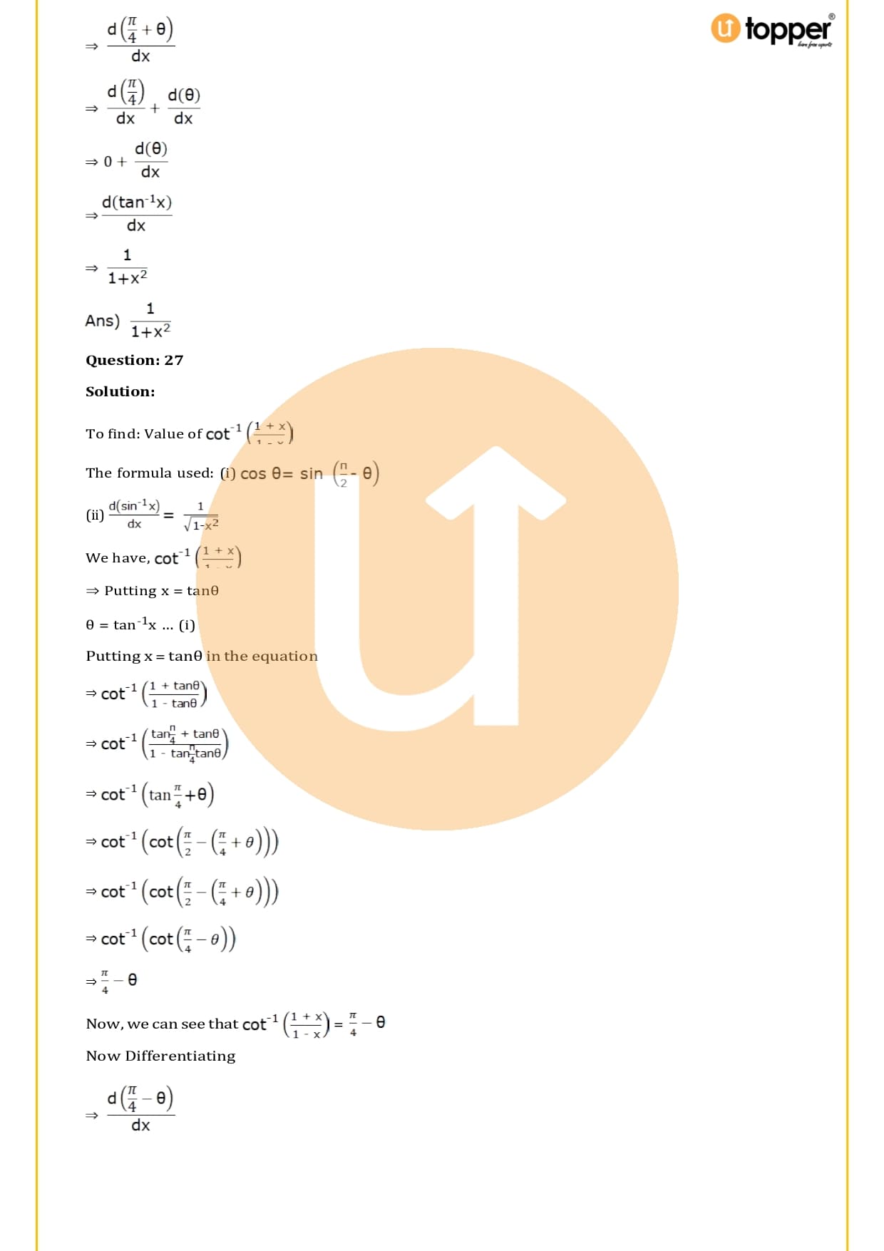 - d/dx (cot−1 x) = −1/d/dx (sec−1 x)= 1/ √(|x|x2–1)